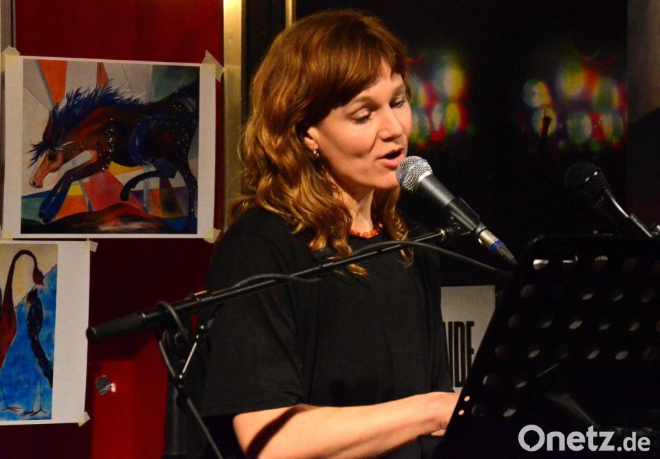 Die Künstlerin saß am E-Piano, sang mit ruhiger, eher leiser Stimme und ließ elektronische Klänge in ihre Songs einfließen. Stücke wie "Here", "Berlin" oder "Kämmerlein" wirkten dabei fast wie kleine Klangbilder. Das passte gut zum Konzept des Abends: Hinter und neben der Bühne waren auch Nachdrucke ihrer Acrylbilder zu sehen, die Tiere zeigten. Was kein Zufall war, wie sie erzählte. Sie sei neben einem Kuhstall aufgewachsen und habe dort viel Zeit verbracht.