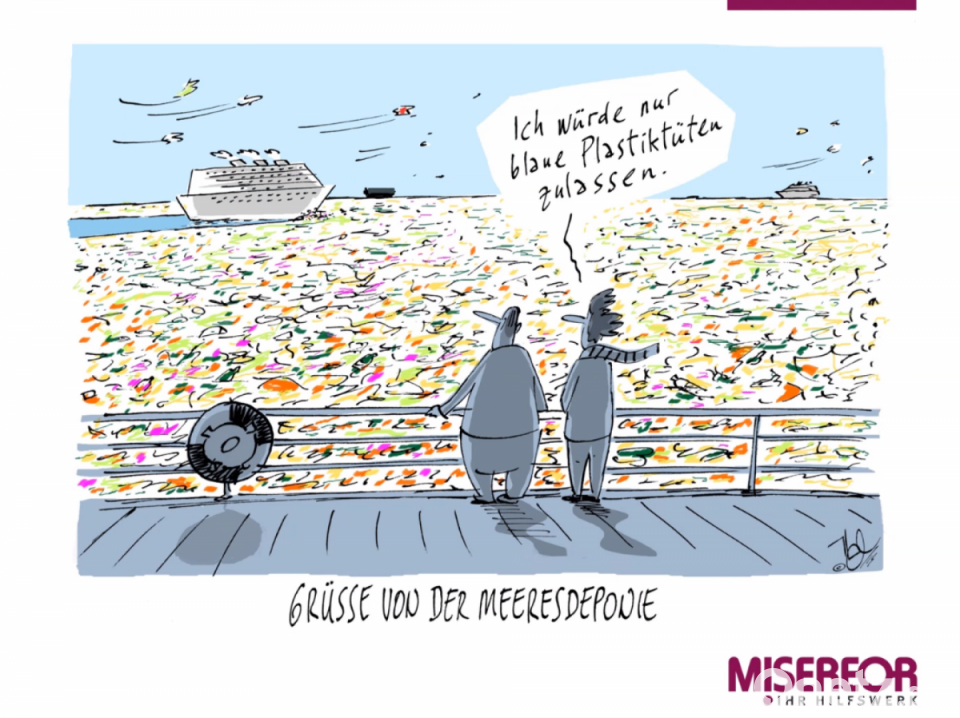 Gefährdet sei auf der Erde ein „über Jahrmillionen ausdifferenziertes System“. Und obwohl Nahrungsmittel für 12 Milliarden Menschen produziert würden, gebe es 795 Millionen Menschen, die hungerten. Der brennende Regenwald im Amazonas habe auch etwas mit uns zu tun, betonte Schmidt und erinnerte an die Enzyklika "Laudato si – Über die Sorge für das gemeinsam Haus" von Papst Franziskus. Genau solche Gedanken seien von den Karikaturisten ausgedrückt worden. Besucher der Ausstellung sehen zum Beispiel ein hungerndes Kind an dem ein Pkw mit der Ausschrift „Ich tanke Bio-Sprit“ vorbeifährt oder die Frage eines Korb-Verkäufers „Brauchen Sie eine Tüte für den Korb?“.