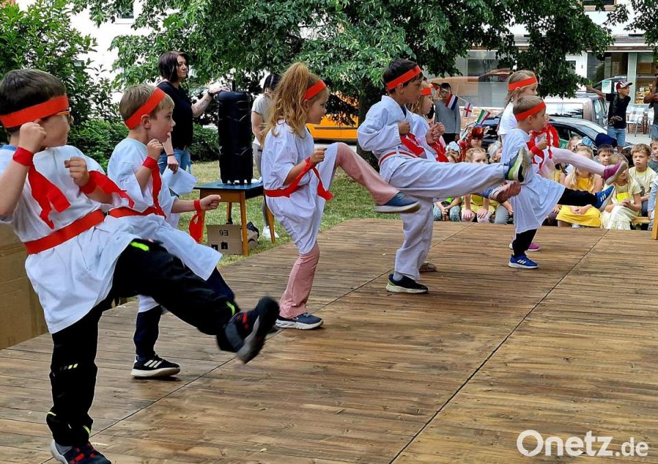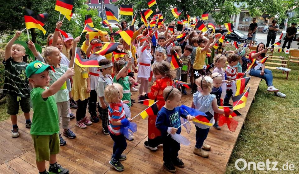 Zur amerikanischen Hymne sangen die Kinder dann „Alles ist größer da, darum bleib ich gleich ein Jahr“. In Asien angekommen, tanzten die Vorschüler zu „Kung fu fighting“ und chinesischer Musik. Schließlich ging es noch nach Australien. "Dort lebt ein Freund, das Känguru, bei dem bin ich ab und zu", lautete der Refrain in diesem Lied. Die Kinder tanzten dazu einen Schlangentanz. Schließlich blieb noch Europa. Bei einem Länderquiz wurden gar die Eltern mit einbezogen. Die Jüngsten nannten ein Symbol aus dem Land, wie den Schiefen Turm, die Eltern mussten erraten, dass es Italien ist. Zum Abschluss sangen sie „Deutschland, wir sind deine Kinder“.