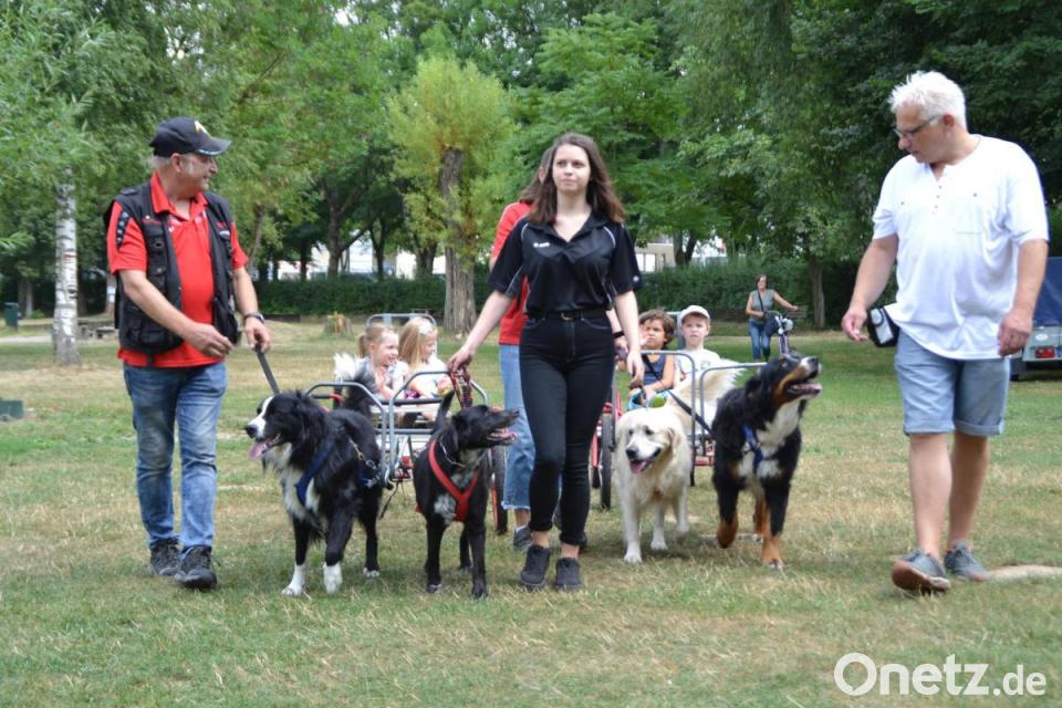 Interessant war die Schau der Wasserwacht, die neben ihrem Einsatzfahrzeug und dem Rettungsboot auch Taucheranzüge und diverse Gerätschaften für die Wasserrettung präsentierte. Die Kinder hatten auch beim Kübelspritzen der Jungfeuerwehrler ihren Spaß. Tapfer und fleißig wie immer: die Vierbeiner des Zug- und Begleithundevereins. Sie zogen die kleinen Besucher des Familien- und Kinderfests geduldig durch das weitläufige Gelände.