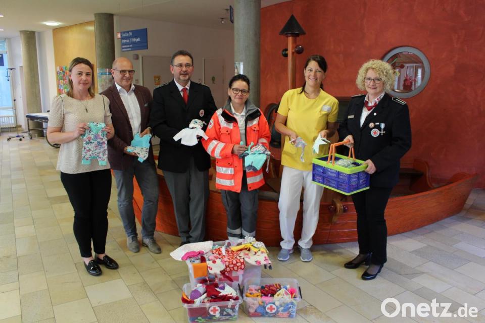 Unter der Regie der gelernten Schneiderin Steiner wurde also genäht – und das Ergebnis war außerordentlich: kistenweise konnte das BRK jetzt Schühchen, Söckchen, Sets mit Strampler, Hosen und Mützen in den Größen 38 bis 52 sowie Einschlagtücher für Brutkästen an die Kinderintensiv- und Frühgeburtenstation übergeben. Die Freude darüber war riesig: „Wir merken im Gespräch mit Eltern immer wieder, dass es diese Kleidung im Handel kaum gibt. Und Söckchen oder Mützchen wärmen die Kinder natürlich auch“, betonte Tanja Wittmann, Leiterin der Kinderintensiv- und Frühgeburtenstation. Auch Pflegedirektor Thomas Baldauf dankte: „Es ist extrem wichtig, dass wir Frühgeburten in der Region versorgen können. Und wir freuen uns außerordentlich, wenn sich Personen für die Gesundheitsversorgung unserer kleinster Patienten einsetzen, die nicht direkt betroffen sind.“