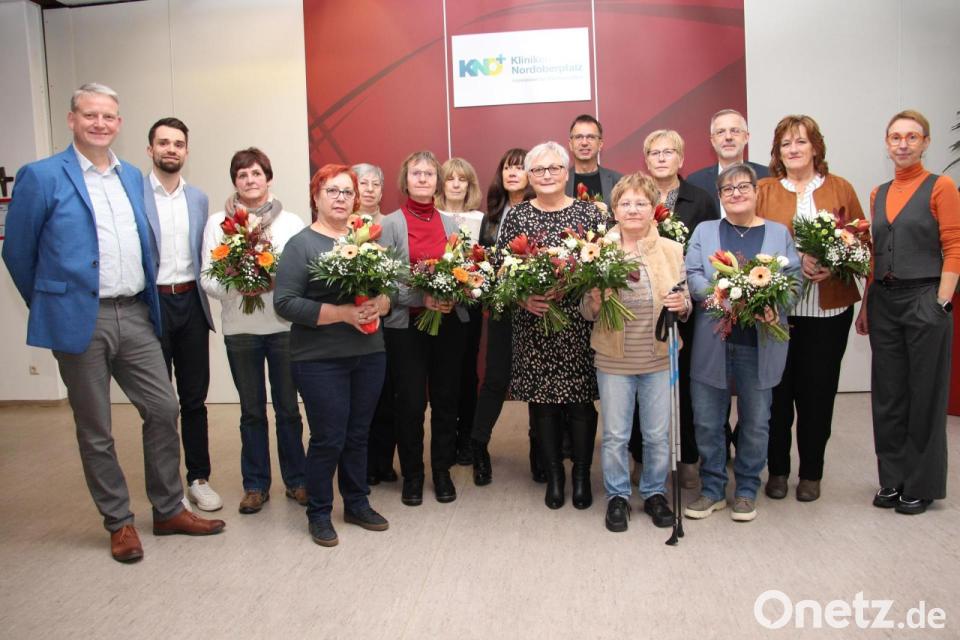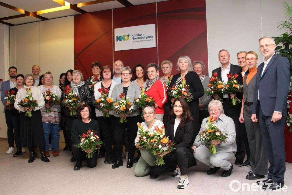 Michael Hoffmann, Vorstand der Kliniken Nordoberpfalz AG, überreichte zusammen mit Klinikdirektor Timo Sonntag, Personalleiter Mathias Weiß und Pflegedirektorin Angela Dzyck Blumen und Gutscheine an die geehrten Mitarbeiter. Hoffmann betonte die Bedeutung der langjährigen Treue der Mitarbeiter für die Gesundheitsversorgung in der Region. „Egal in welcher Abteilung, Sie arbeiten alle mit, dass bei uns Menschen ein Stück glücklicher rausgehen, als sie hereingekommen sind. Das ist etwas Schönes“, sagte Hoffmann.