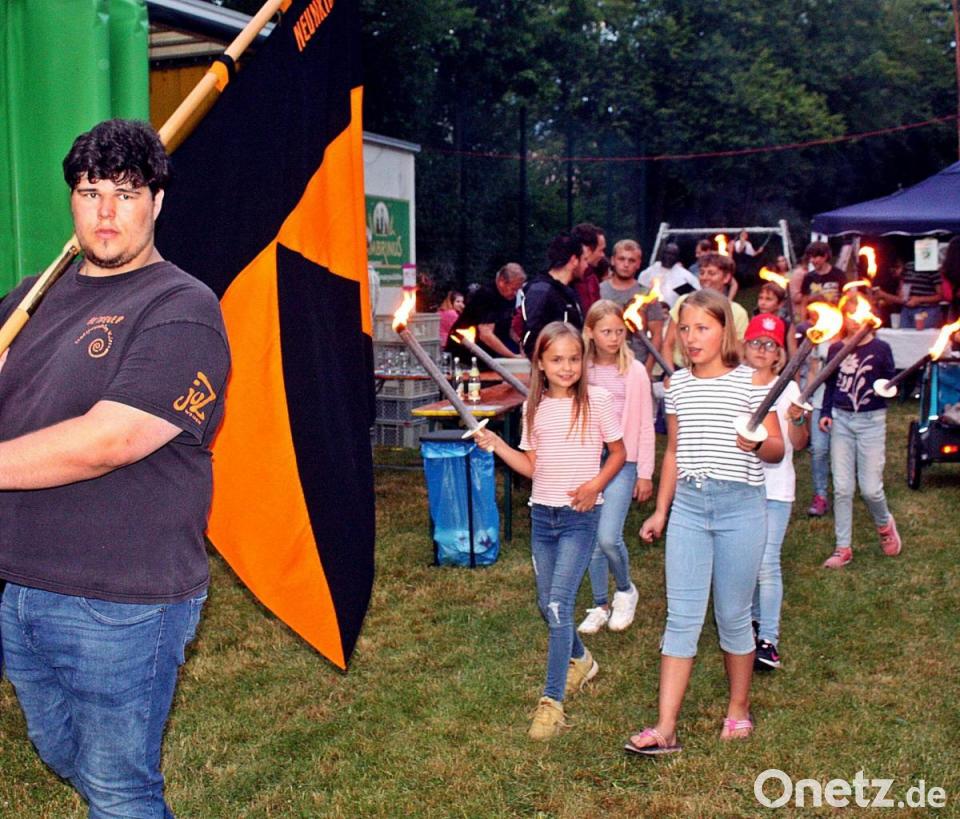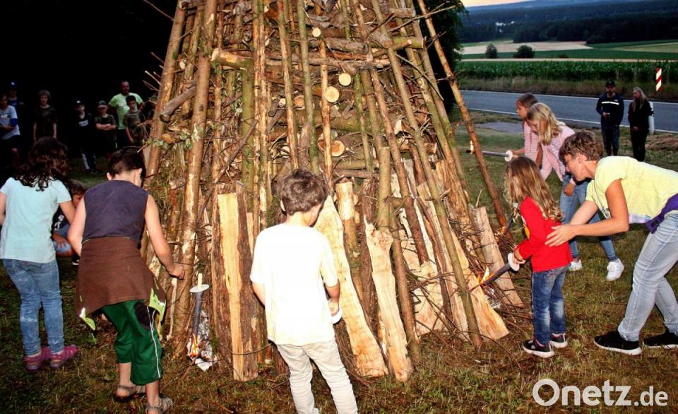 Die Kolpingjugend zieht mit Fackeln zum Holzstoß. Die Kinder lassen dann unter Aufsicht den Funken überspringen.