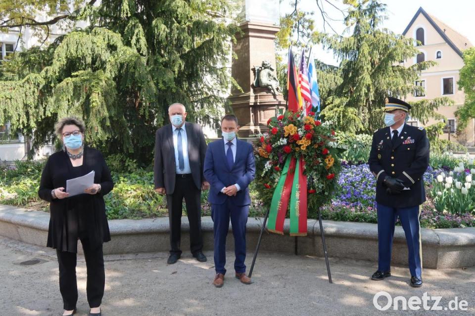 Exakt an dem Platz, wo am 8. Mai 1945 die Amerikaner in Weiden mit einer Siegesparade das Ende des Zweiten Weltkriegs in Europa feierten, legten am Freitagvormittag Oberbürgermeister Jens Meyer, Bezirkstagsvizepräsident Lothar Höher und Colonel Adam J. Boyd von der US-Army Garrison Bavaria einen Kranz nieder. Das Gustav-von-Schlör-Denkmal wurde dazu auserwählt, weil es ein besonders geschichtsträchtiger Ort ist.