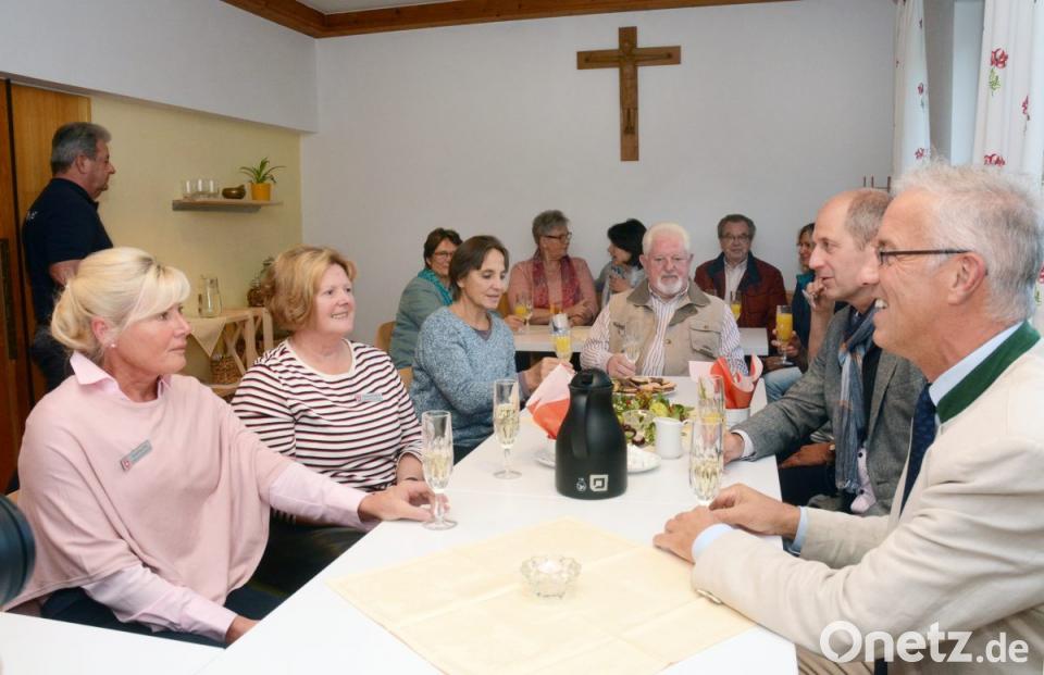 Gäste und Helfer versammeln sich um Pfarrer Dominic Naujoks. Bei Süßigkeiten, Salzstangen und Sekt dankt er den Umstehenden für ihr gesellschaftliches Engagement: Die Bürger der Gemeinde seien Bausteine der Gemeinde. Und auch Stadtrat Hans Blum zollt Anerkennung: "Die Leute hier nehmen Schicksale in die Hand." Am Dienstag haben Hedwig Fröhlich und Karolina Ost von den Maltesern im ehemaligen Clubraum das "offene Trauercafé" eröffnet.