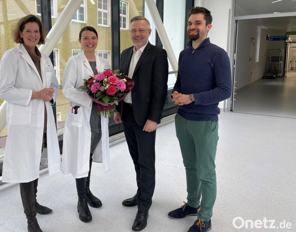 Lena Meier stammt aus Etzenricht und lebt mit ihrem Mann in Weiden. Sie arbeitet seit 2019 bei der KNO. Für ihre neue Aufgabe als Chefin von 17 Mitarbeiterinnen und Mitarbeitern wünschten ihr Vorstand Michael Hoffmann, Ärztliche Direktorin Prof. Dorothee Bremerich und Klinikdirektor Timo Sonntag alles Gute.