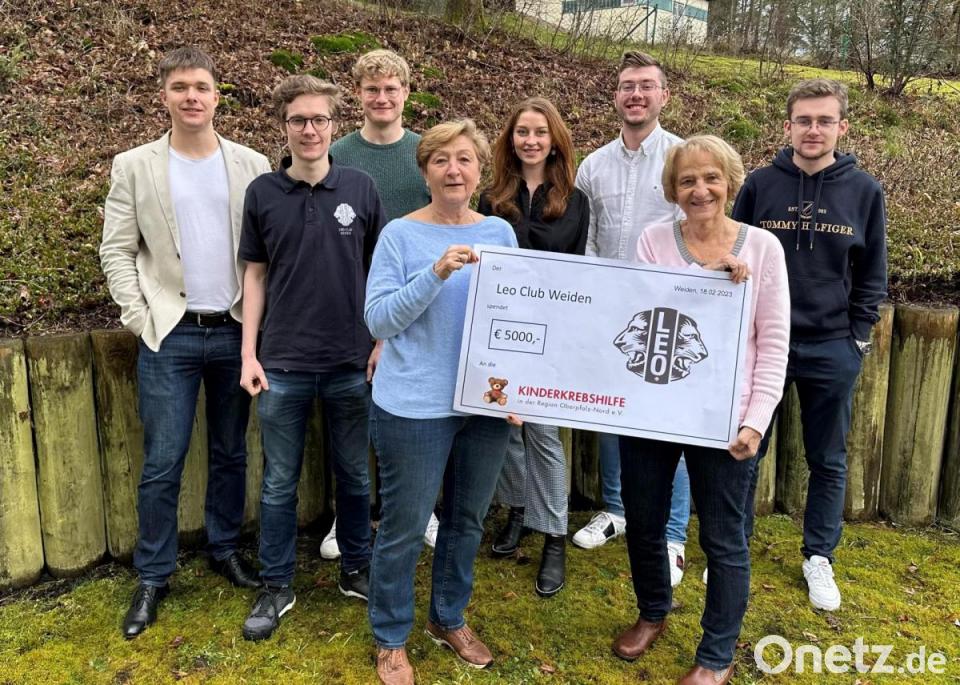 Einen symbolischen Scheck über 5000 Euro hat der Leo-Club Weiden um Präsident Maximilian Märtin und Sekretär Kevin Hälsig an Petra Troppmann, Jutta Harbig und Hartmut Ordnung von der Kinderkrebshilfe Nordoberpfalz überreicht, wie aus einer Mitteilung hervorgeht. In der Adventszeit 2022 verkaufte der Leo-Club Weiden wieder Glühwein für einen guten Zweck auf dem kunsthandwerklichen Weihnachtsmarkt in Tirschenreuth. Dieses Mal war die Aktion der Kinderkrebshilfe in der Region Oberpfalz-Nord gewidmet. An zwei Wochenenden erlösten die Leos nach über 2000 verkauften Tassen Glühwein 5000 Euro. Der Scheck mit der entsprechenden Summe wurde in den Räumlichkeiten der Kinderkrebshilfe in Weiden übergeben.