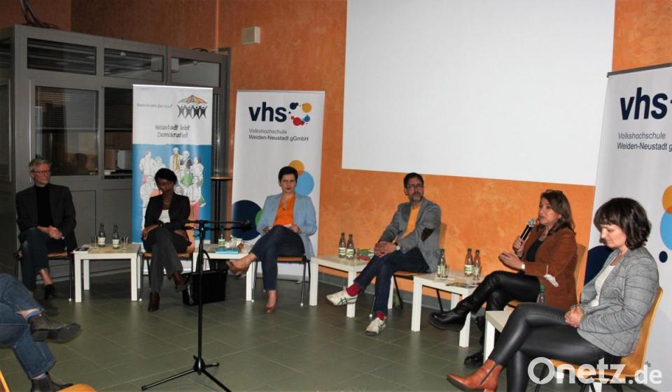 Die Podiumsrunde wurde ergänzt durch Sema Tasali-Stoll, Naima Mohamed Omar und Enikö Nagy. Moderiert wurde das Gespräch von Arno Speiser von „Neustadt lebt Demokratie“ sowie Tanja Fichtner, Pädagogische Leiterin der Volkshochschule Weiden-Neustadt. Naima Mohamed Omar hat verschiedene Formen des Alltagsrassismus in Weiden erlebt – so sei sie beispielsweise bespuckt worden, als sie mit dem Fahrrad fuhr. In einem Kleidungsgeschäft habe eine Verkäuferin ihr die ausgesuchte Jacke abgenommen, da man einer dunkelhäutigen Frau, so empfand sie es, nicht zugetraut habe, dass sie sich das leisten könne. Enikö Nagy betonte, dass sie in Deutschland keinen „offenen Rassismus“ persönlich erlebt habe. Das sei zweifellos auch mit dadurch bedingt, dass sie eben nicht „ausländisch“ ausschaue. Sich selbst bezeichnet sie als „Ungarin, die in Rumänien geboren wurde und in Deutschland aufgewachsen ist“. Sie bemängelte, dass das Wort „Ausländer“ in Deutschland oftmals immer noch mit bestimmten negativen Interpretationen verbunden sei. „In vielen anderen Ländern bedeutet es etwas Buntes und Positives“, so Nagy.