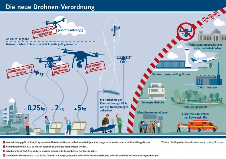 Es gibt zwar Ausnahmegenehmigungen und unterschiedliche Regelungen in den Bundesländern, die wichtigsten Eckpunkte der Drohnenverordnung geben jedoch Orientierung. Sie gelten beim Besitz einer kostenpflichtigen Allgemeinerlaubnis, die man beim zuständigen Landes-Luftfahrtamt beantragen muss: