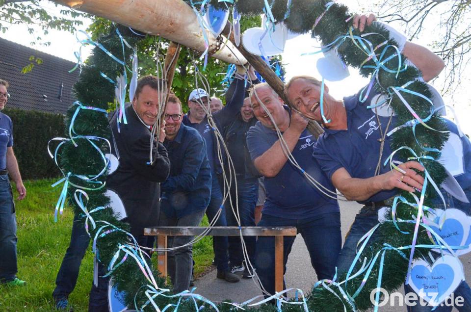 Kindergartenkinder von Lorenz-Werthmann banden Herzen um den Stamm, der anschließend im Beisein von Stadtpfarrer Gerhard Pausch und der Muskelkraft zahlreicher Siedler hochgehievt wurde. An den Stangen: Bürgermeister Jens Meyer und Siedler-Chef Wolfgang Pausch. Die Siedlerjugend weihte ihr neues Festzelt ein.