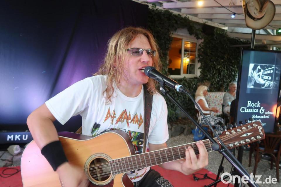 "Rock Classics und seltene Schmankerln akustisch serviert." Immer wenn Mathias „Lemmy“ Kiener gemeinsam mit AC/DX. auftritt, liefert er die ganz große Show: Kanonendonner, Feuerfontänen, Glocke. Wenn er allein und unplugged auf musikalische Zeitreise geht, lässt es der Pleysteiner meist ruhiger angehen. Bei der letzten Biergarten „Live Stage“ vor der Sommerpause am Freitag, schmückte er seinen Auftritt allerdings erstmals mit Multimedia-Elementen. Sprich: Auf einem Bildschirm wurden Jahreszahlen, Bilder oder Texte eingeblendet.
