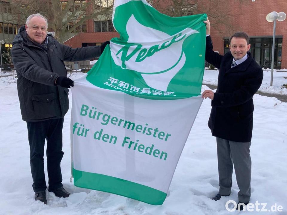 Vor dem Hintergrund des Inkrafttretens des Atomwaffensperrvertrages der Vereinten Nationen hissten Oberbürgermeister Jens Meyer und Bürgermeister Lothar Höher am Freitag die Flagge vor dem Neuen Rathaus.