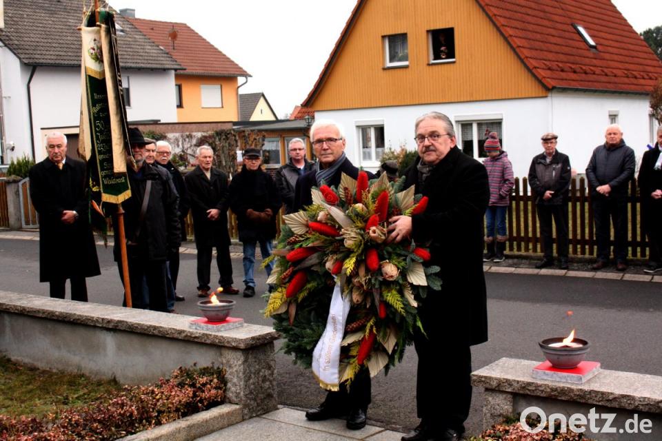 Gemeinsam legten sie einen Kranz nieder. Karl Weißer spielte auf der Trompete das Lied "Ich hatt` einen Kameraden“.