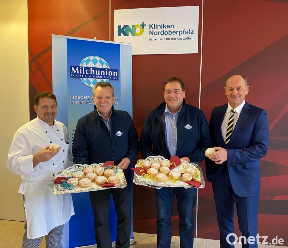 Christian Regner und Josef Plank vom Team Frischdienst der Milchunion Weiden brachten die süßen Hefegebäckstücke im Klinikum Weiden vorbei, teilt dessen Pressestelle mit: „Das ist ein Dankeschön und auch ein Zeichen der Wertschätzung für alle Mitarbeiter, die täglich für kranken Menschen in unserer Region da sind. Und bei den Patientinnen und Patienten, die derzeit im Krankenhaus behandelt werden, sollen die Krapfen zumindest für ein bisschen Faschingsstimmung sorgen.“