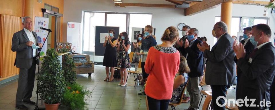 Der so Geehrte zeigte sich in seiner Abschiedsansprache recht bescheiden und sprach von einem „Geschenk der 35 Jahre“. Vorrangig komme es „auf das gemeinsam Erreichte an“. Und schließlich sei man ja auch nur dem öffentlichen Bildungsauftrag nachgekommen. Mit Blick auf die kommunalen Vertreter sagte Dietrich: „Wir sind ein Kind der Kommunen und werden von ihnen getragen.“ Bürgermeister Lothar Höher nannte Dietrich in seinem Grußwort „das Gesicht der VHS“. Und er würdigte auch Dietrichs außerberufliches Engagement unter anderem bei der Begründung der Partnerschaft mit Marienbad.
