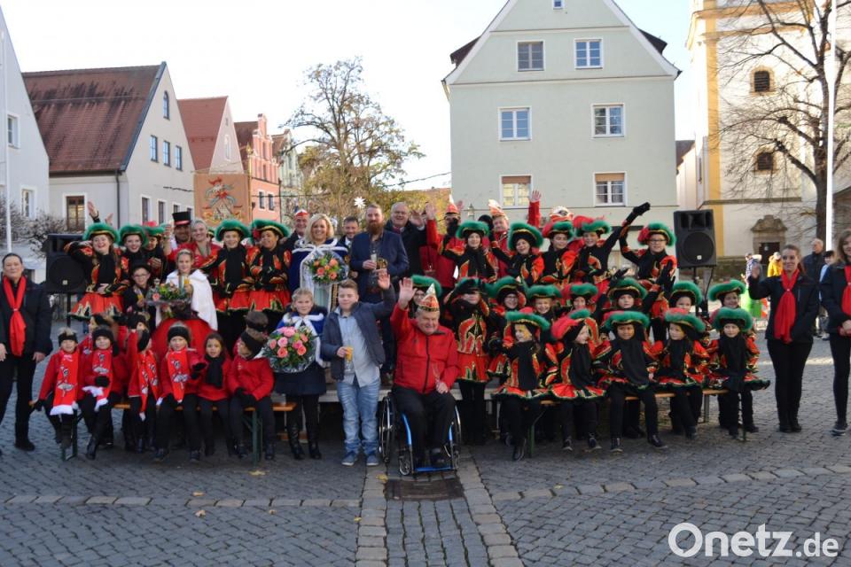 Ehemalige Faschingshoheiten, der gesamte Narrhalla-Hofstaat, Kommunalpolitiker und Bürger in großer Zahl empfingen das alte und das neue Prinzenpaar. Aber nicht wie sonst üblich auf der Rathaustreppe fand die Proklamation heuer statt, sondern mitten auf dem Vorplatz am Oberen Markt. Eine Stelle, die sich bewähren sollte. Narrhalla-Ehrenpräsident Xaver Schreiber und auch OB Kurt Seggewiß schwärmten anschließend in höchsten Tönen davon, dass dieser Platz viel besser zum Festakt passe.