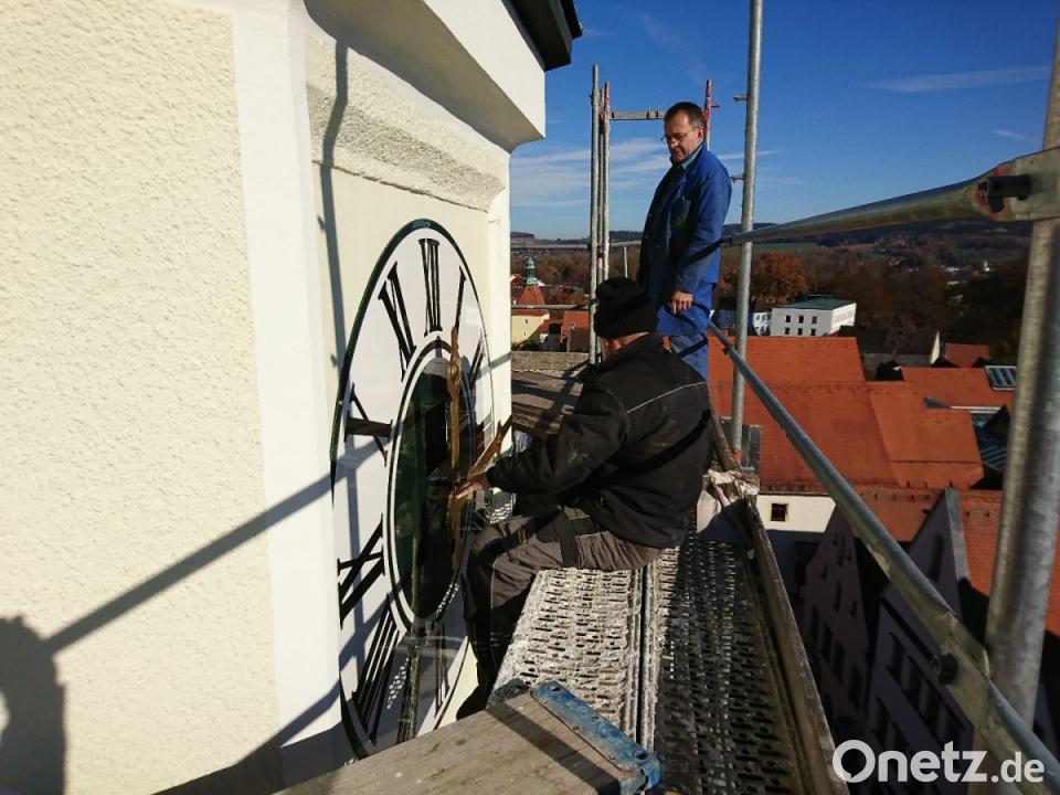 Über den Köpfen der Weidener installierten die Arbeiter der Regensburger Traditionsfirma Turmuhren Rauscher nun die erneuerten Ziffernblätter und Zeiger der Turmuhr am Alten Rathaus."Die Zeiger und die Wellen der 1965 letzmalig überarbeiteten Turmuhr waren derart verostet, dass eine Überarbeitung nicht mehr genügte", erklärt das Baudezernat. Bei weiterem Betrieb der Uhr hätte gar die Gefahr bestanden, dass die Zeiger abfallen. Und so entschied sich die Hochbauabteilung der Stadt, im Zuge der Dach- und Fassadensanierung des Alten Rathauses auch die Zifferblätter der Turmuhr grundlegend zu erneuern. So erhielt die vierseitige Uhr neue Zifferblätter aus Duroplat, eine nichtrostende Edelstahlwelle und obendrein neue mit 24-karätigem Blattgeold verehene Zeiger aus Kupfer mit einer Unterkonstruktion aus Edelstahl in gotischer Kreuzform. Kostenpunkt inklsuvie Elektrik: rund 10000 Euro, teilt die Stadt auf Nachfrage mit.