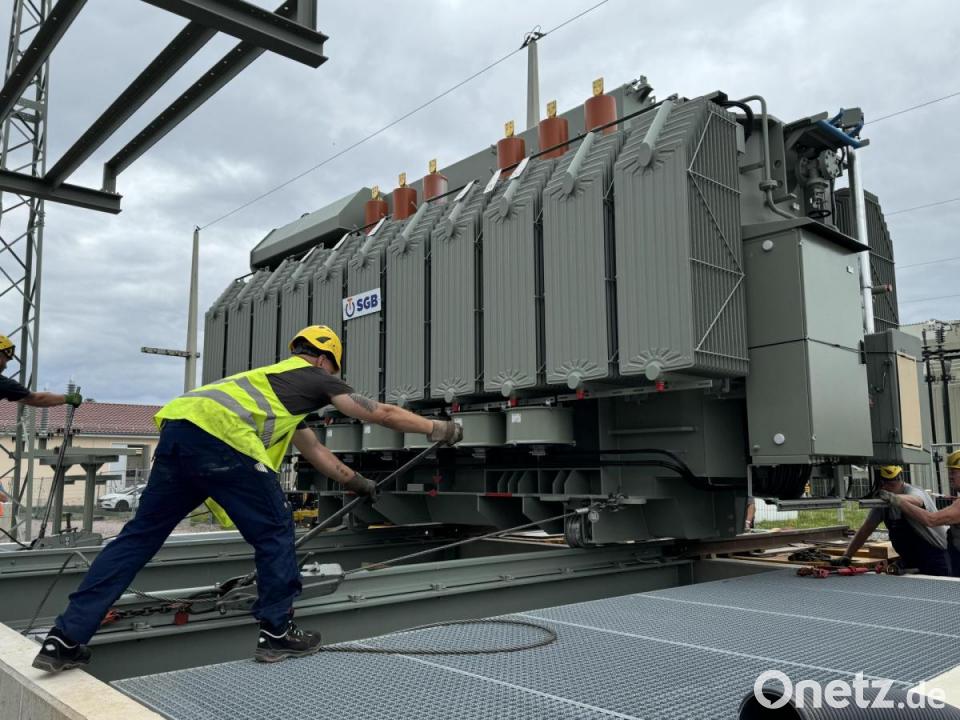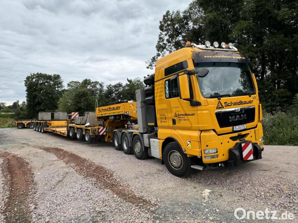 Jeder der neuen Trafos kostet eine Million Euro. Zwei Bauarbeiter haben das 56 Tonnen schwere Gerät mit zwei Seilwinden und einem ausgeklügelten Schienensystem vom Tieflader auf das Fundament gezogen. Angeliefert wurde der riesige Trafo als Schwertransport über die A93 in der Nacht zum Dienstag mit einer 640 PS starken Vierachs-Zugmaschine und einem Achtachs-Tieflader aus Regensburg. Denn der Trafo ist „Made in Oberpfalz“, hergestellt von der Starkstrom-Gerätebau GmbH aus Burgweinting. Wegen des enormen Gewichts von 56 Tonnen musste neben der alten Brücke außerdem für die Überquerung der Waldnaab extra eine Behelfsbrücke gebaut werden.