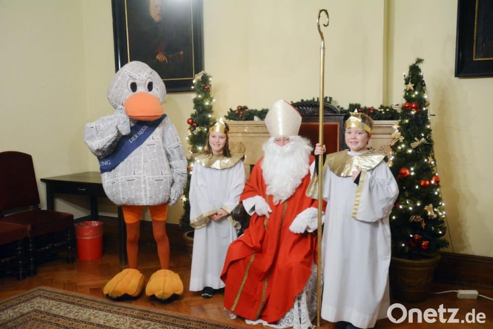 Fototermin im Rathaus: Zeitungsente Paula Print, Engelchen Thomas Kammerer und Lea Stadler und der Nikolaus.