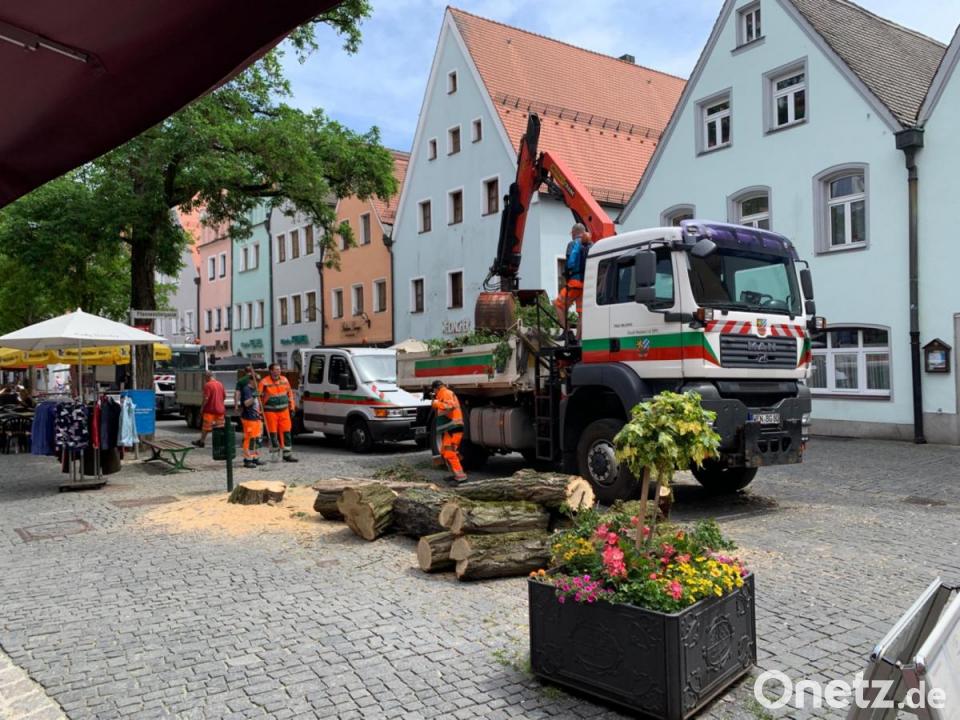 Dieser Baum hatte einen gefährlichen Hang zur Neigung. Bereits seit geraumer Zeit tanzte die etwa 40-jährige Robinie auf dem Oberen Markt aus der Reihe, kippte leicht in Richtung der Passantenköpfe. Den Experten der Stadtverwaltung blieb das nicht verborgen. Wie Stefan Dürgner von der Stadtgärtnerei informiert, stand der 14-Meter-Baum unter Beobachtung. Wiederholt maßen die Mitarbeiter den Schiefstand – und der „schien immer wieder leicht zuzulegen“. Der kritische Punkt war schließlich nach dem Gewitter am Montag erreicht. „Wurzeln waren aufgerissen, ein richtiges Loch hat sich aufgetan“, berichtet Dürgner. Am Dienstagmittag rückte der Gärtnerei-Trupp mit Hebebühne an. Vor den Augen vieler Passanten kappte er zunächst die Äste, dann den Stamm. Nur etwa eine Stunde dauerte es, bis die stolze Robinie zu Kleinholz verarbeitet war. Im Herbst so kündigt Dürgner an, werde Ersatz nachgepflanzt.