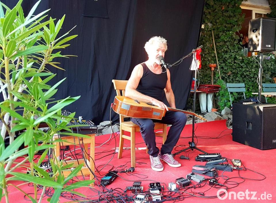 Mit solchen und anderen Geschichten lockerte der Marburger am Freitagabend sein Konzert zur Eröffnung der Sommer-Live-Stage vor dem „Parapluie“ auf. Es war ein Superstart im Biergarten bei herrlichen Temperaturen. „Bornzero“ Bornschlegel galt als damaliges Mitglied der beiden Bands „Guru Guru“ und „Atlantis“ in den 70ern als einer der besten Rockgitarristen des Landes.