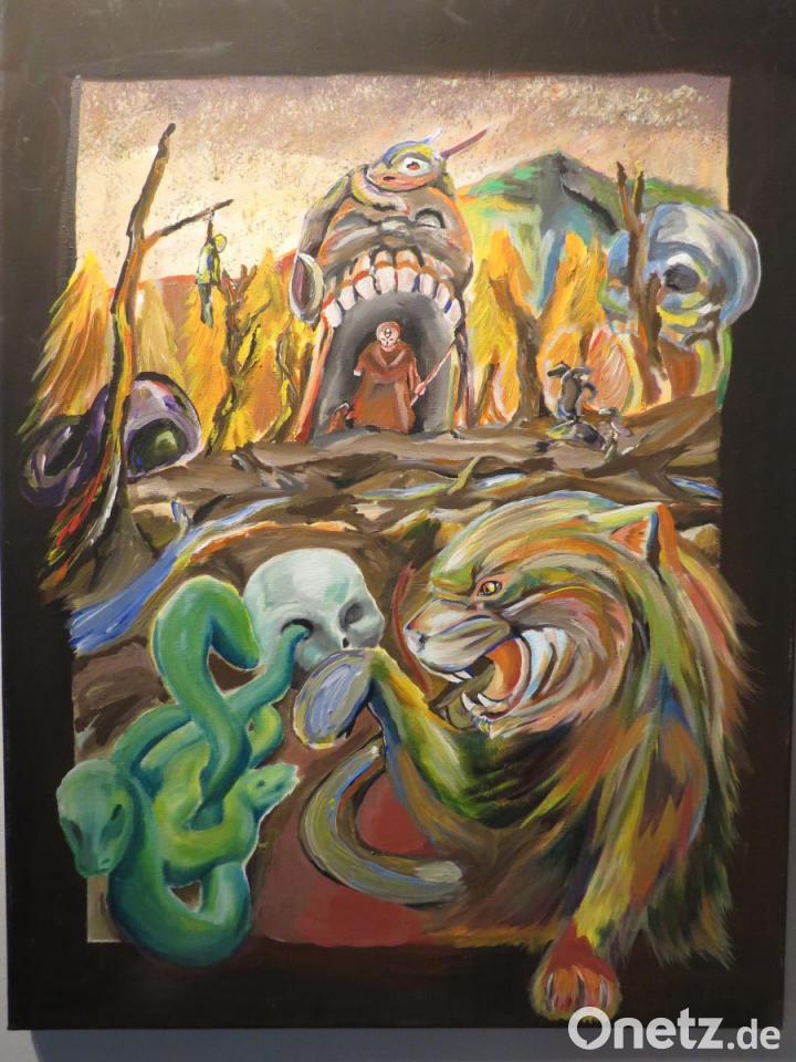 Mit der Schülerin Bettina Hammer von der Fachhochschule Weiden präsentierte die Vorsitzende die diesjährige Preisträgerin des OKV. Bettina Hammer malt surrealistische „Traumbilder“. Sie scheut sich nicht davor, mitunter auch die Schattenseiten der Lebensformen großflächig herauszuarbeiten.