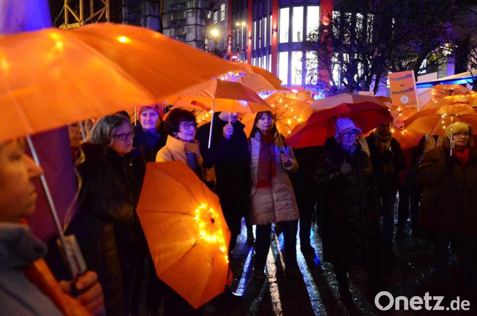 Leise, fast andächtig, bewegte sich am Dienstagabend die orangefarbene Lichterkette durch die Innenstadt. Rund 120 Frauen und einige männliche Unterstützer hatten sich zum Orange Walk versammelt, dem weithin sichtbaren Höhepunkt der Orange-Day-Wochen in Weiden. Mit beleuchteten Regenschirmen zogen sie vom Neuen Rathaus durch die Schulgasse über die Bürgermeister-Prechtl-Straße zum Oberen Markt vors Alte Rathaus. Ins warme Farbspiel mischte sich lediglich das bläuliche Aufblitzen der sie begleitenden Streifenwagen.
