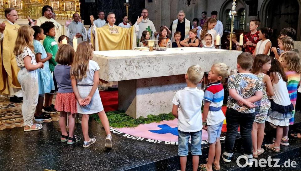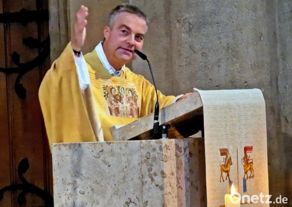 Die Glocken läuteten am Sonntagvormittag zum Gottesdienst, in dem Pfarrer Markus Schmid sein 25. Priesterjubiläum feierte. Eine Ikone, die ihm am Herzen liegt und die Freundschaft zwischen dem heiligen Menas und Jesus symbolisiert, und die große Zahl „25“ schmückten den Altarraum.