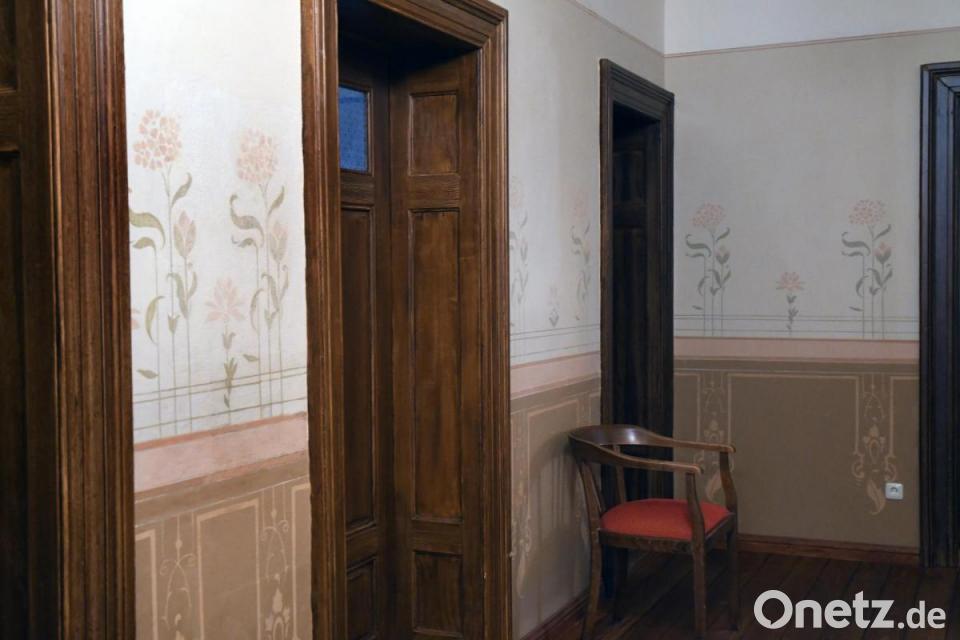 Der kulturgeschichtliche Schatz offenbart sich vor allem an den Wänden. „Hier kamen zum Großteil originale florale Malereien zum Vorschein, die wir natürlich erhalten haben“, sagte Pfarrer Schmid. Wo das nicht möglich war, seien von den vorhandenen Wandmustern Schablonen angefertigt worden, um sie zu übertragen. Ob im Arbeitszimmer, im Essbereich, im Treppenhaus oder den privaten Räumen im oberen Stockwerk, setzen zarte Blütenranken Akzente.