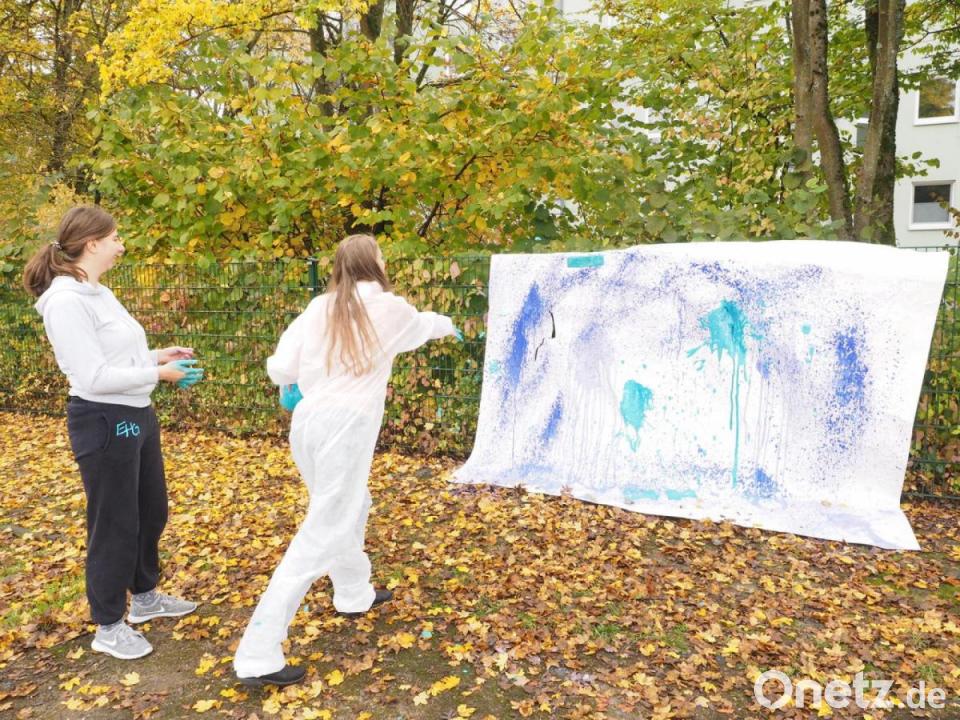 Feldmann war in der Gruppe, die sich dem Hintergrund widmete. Sie machten Testversuche an einer Wand im Freien, "um zu sehen, wie das dann am Ende aussieht". Dann ging es nach drinnen an die "Lateinwand". Um zu vermeiden, dass die Farbe überall hinspritzt, deckten sie die Wand mit Planen ab. Dann ging es los. Mit Kleisterpinseln, Schwämmen und Wasserbomben warfen, spritzten und zeichneten sie lila, hellblaue, rote und dunkelblaue Farbe auf die Wand. "Die Wasserbomben haben am meisten Spaß gemacht", schwärmt Feldmann. "Die Farbexplosionen waren sehr witzig."