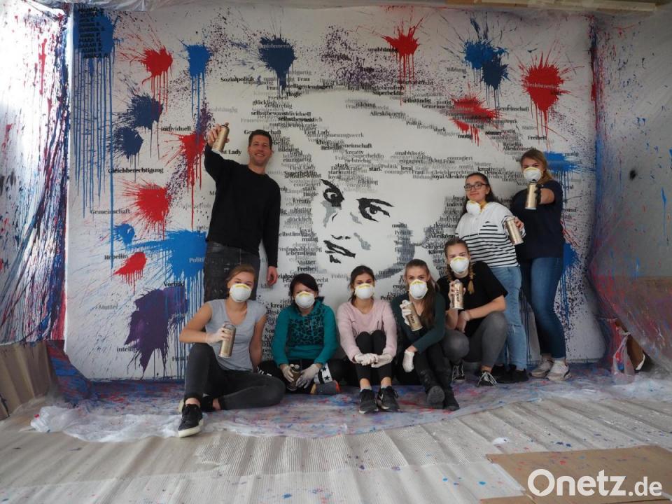 Es sei nicht einfach gewesen, die Latein-Fachschaft davon zu überzeugen, dass sie die Wand freigeben, aber letztlich haben sie "schweren Herzens" zugestimmt, sagt Kunstlehrerin Gilch. Danach ging es an die Gestaltung. Im Internet suchten die Schülerinnen nach einer geeigneten Porträtaufnahme, die sie als Grundlage verwendeten. Als nächstes organisierten sie sich in drei Teams: Organisation, Hintergrund, Schrift.