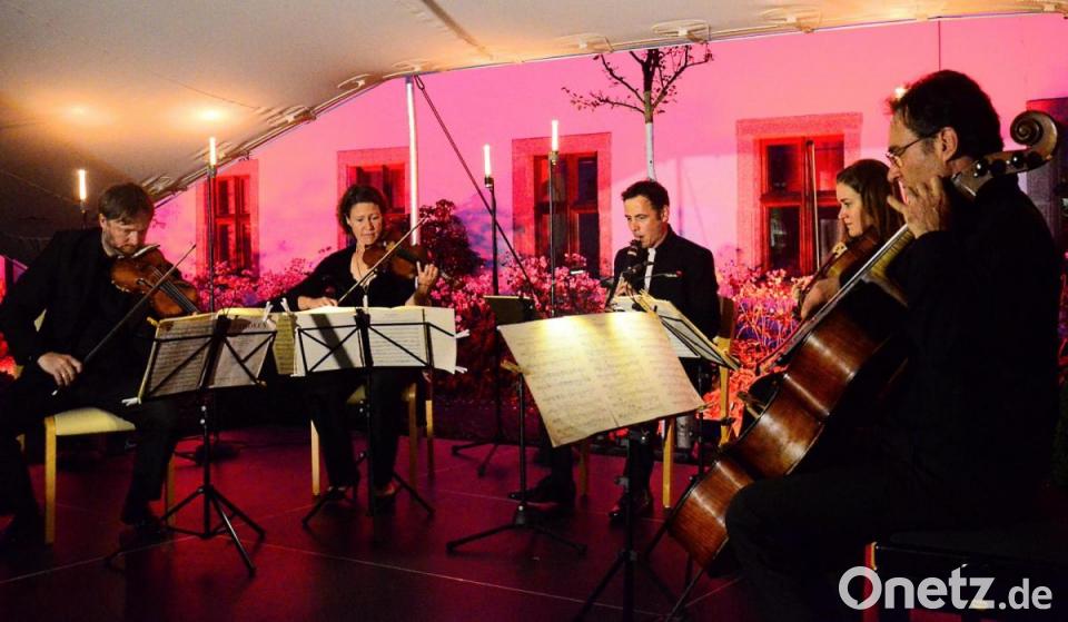Ein wahrer Bilderbuchsommerabend im Innenhof der Regionalbibliothek. Langsam versinkt die Mondsichel hinter dem Westflügel des Barockensembles. Und unter dem Bühnenzelt - einer kurzzeitigen Hinterlassenschaft der "Sommersünde" -, wo am Vorabend noch weiblicher Gesang, Piano, Trompete und Loops beeindruckende Klänge und Sounds erzeugten, umhüllen jetzt ein Hauch von Rot und kerzenähnliche Leuchtkörper aus der Kreativabteilung des "Sündikats" die Musiker vom "Diogenes Quartett" mit mystischem Zauber.