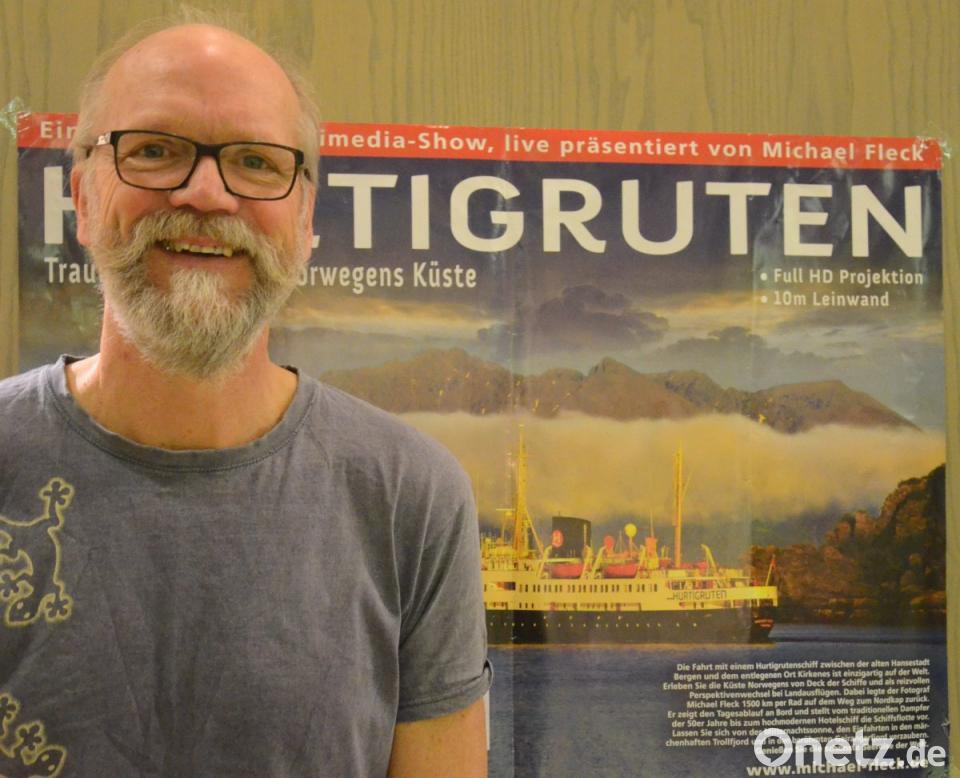 Für den gebürtigen Hamburger Michael Fleck, der mit seiner Familie heute in Baden-Württemberg lebt, musste natürlich auch einmal eine Fahrt mit dem Hurtigruten-Schiff auf den Reiseplan. Fleck ist seit nunmehr 27 Jahren als professioneller Globetrotter in aller Welt unterwegs. In seinen Anfangsjahren reiste Fleck immer mit Frau und den beiden, inzwischen erwachsenen Söhnen. Seine Bilder zeigt er regelmäßig und kurzweilig kommentiert, auf großformatigen Leinwänden.