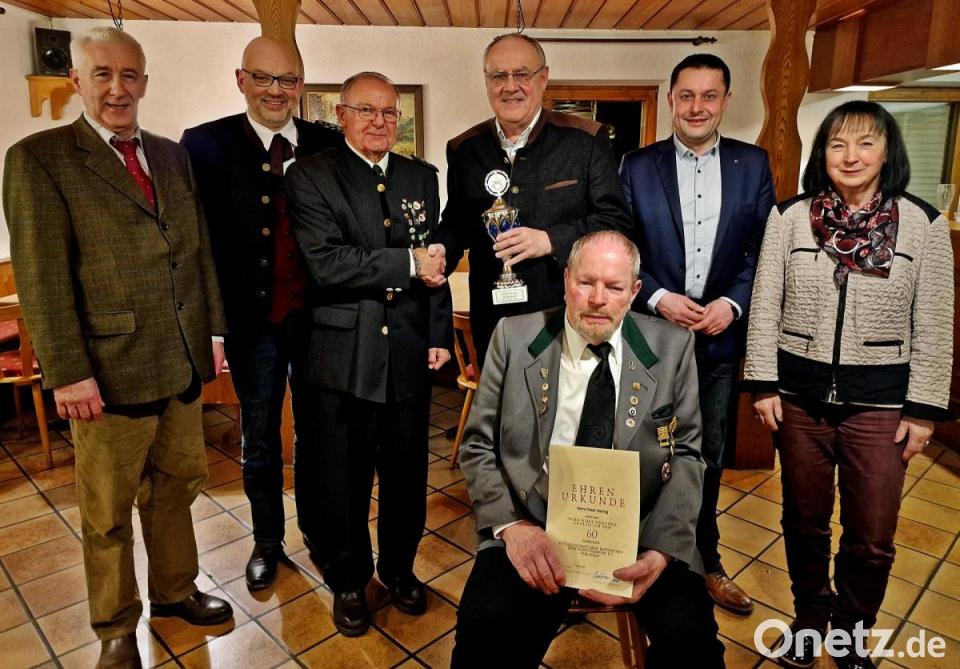 Eine Urkunde lag für Gauehrenmitglied Peter Haring bereit. Er ist 60 Jahre als Mitglied im DSB und im BSSB. Nach Auflösung der Hammerwegschützen wechselte Haring zu den Rehbühlschützen. Den von ihm gespendeten Vereinscup überreichte Bürgermeister Lothar Höher. In Abwesenheit von Karl Schmid nahm ihn der Schützenmeister entgegen.