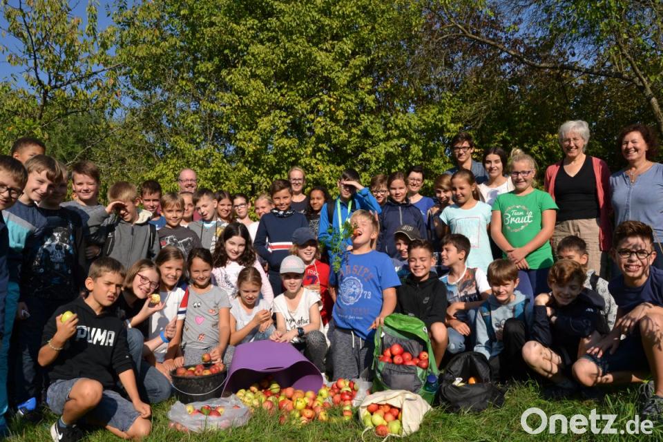 Im 14 000 Quadratmeter großen Lehrgarten betreute „Gartenfee“ Renate Flauger die Kinder. Hier werden Hunderte von alten Obstbaumsorten gepflegt, die zum Teil vom Aussterben bedroht sind. Unter den Apfelsorten finden sich Korbiniansapfel, Freiherr von Berlepsch und Goldparmäne, aber auch bekanntere und „modernere“ Sorten wie Boskop, Jonathan, Golden Delicious und Klarapfel. Flauger erklärte, dass es heuer kleine, dafür aber sehr zahlreiche Früchte gebe.