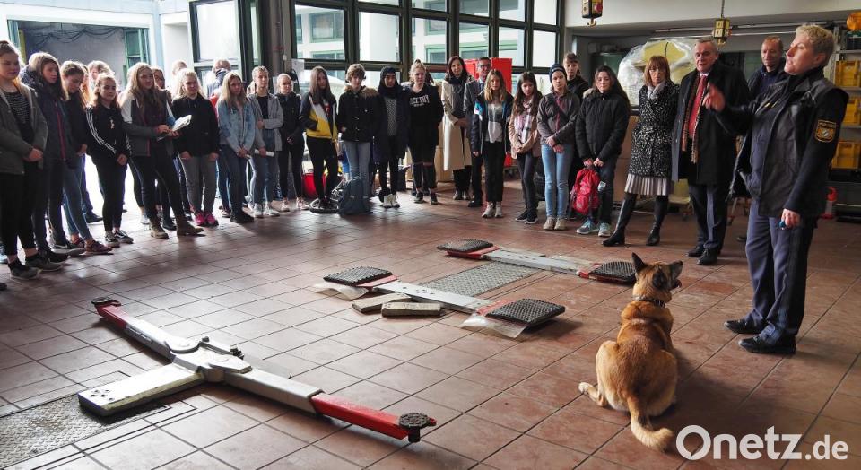 Um Einblick in ihre Arbeit zu vermitteln, hatte sie ihren Diensthund Gero mitgebracht. Er lieferte nach den Kommandos der Hundeführerin zahlreiche Beweise für seine Fähigkeiten. Gero kommt vor allem bei der Rauschgiftfahndung zum Einsatz. „Auf alles was an diesen Substanzen auf dem Markt ist, reagiert Gero super sensibel“, berichtete Gössl. Fast neun Jahre alt sei der Hund, seine Ausbildung hätte zehn Wochen gedauert. Er ist ein Malinois und dem deutschen Schäferhund sehr ähnlich. „Nichts für den Privatgebrauch“, warnt Gössl. Schließlich müsse der Polizeihund „die erforderliche Aggressivität“ aufweisen. Dann zeigte Gero seine Künste und jagte wild durch die Räume und fand nach wenigen Sekunden an mehreren Stellen in der Halle und im Freibereich der Polizeiinspektion verstecktes Ecstacy und Crystal Meth. Kennenlernen durften die Schülerinnen auch die Fahndungskontrollgruppe und die Kriminal- und Verkehrspolizeiinspektion. Mit anwesend am Girl´ Day der Polizei waren auch Oberbürgermeister Kurt Seggewiß und Arbeitsagenturchef Thomas Würdinger, Jobcenterleiter Peter Witt sowie die stellvertretende Landrätin Margit Kirzinger.