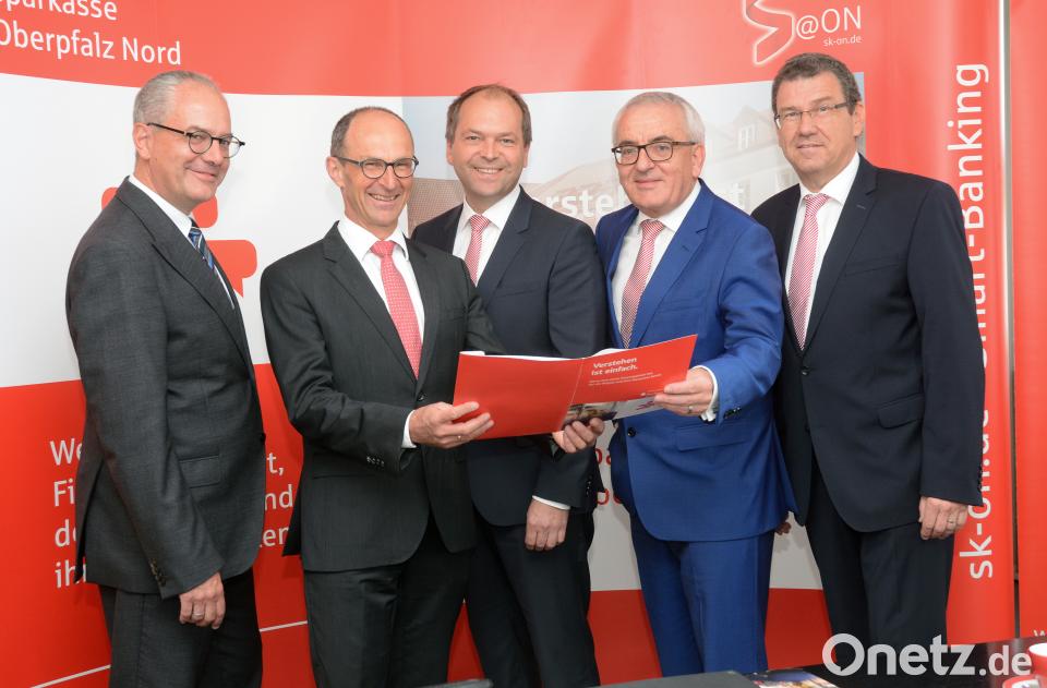 Regionaldirektor Rudolf Pitzl und Vorstandsvorsitzender Erwin Bumberger von der LBS informieren in der Sparkasse Oberpfalz Nord mit Vorstand Hans-Jörg Schön und Vorstandschef Ludwig Zitzmann sowie Immobilienfachmann Wilfried Doll (von links) über die Lage auf dem Immobilienmarkt in Bayern und in der Region.
