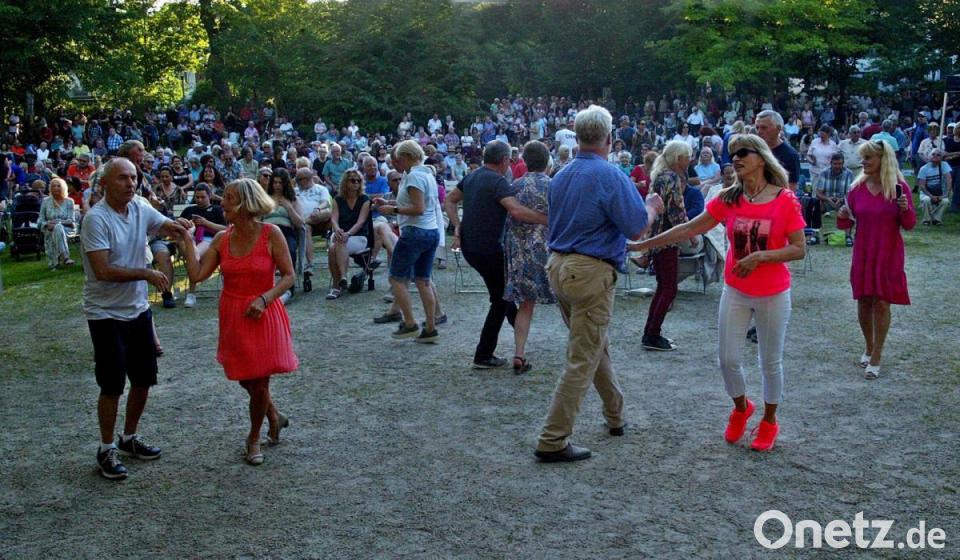 Die Band, inzwischen bei den Serenaden immer gesetzt, eröffnete mit „Let's have a party“. Das Publikum sang und klatschte von Anfang an mit. Nicht nur das: Auf dem „sandigen“ Parkett vor der Pavillon-Bühne tanzten mehrere Paare. Unter sie mischte sich bisweilen auch Sängerin Silke Husslik. Insbesondere das Peter-Kraus-Medley mit „Sugar Baby“ und „I'm Walking“ heizte die Stimmung an. Bei „Kansas City“ begann Horst Petzold am Piano, dann stimmte "Special-Guest" Hans (Wyman) Zitzmann mit seiner Mundharmonika ein, und Sandra Adam unterstützte gesanglich.