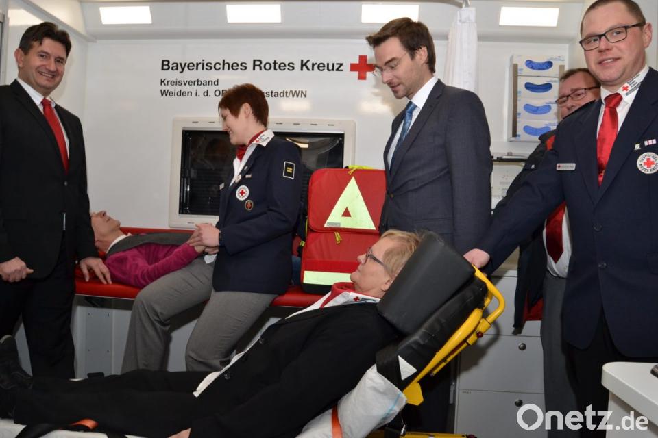 "Alle Rotkreuz-Aktiven sind begeistert. Eine wirklich sinnvolle Anschaffung", stellte BRK-Kreisgeschäftsführer Sandro Galitzdörfer fest. Wegen der Vielzahl von Veranstaltungen und dem damit verbundenen Sicherheitsbedürfnis, sowohl der Veranstalter als auch der Besucher, hatte sich die Vorstandschaft des BRK-Kreisverbands Weiden-Neustadt/WN entschlossen, eine mobile Sanitätsstation anzuschaffen. Am Freitagabend übergab Altlandrat Simon Wittmann als Vorsitzender des Kreisverbands die Schlüssel für die hypermoderne Station an Galitzdörfer.
