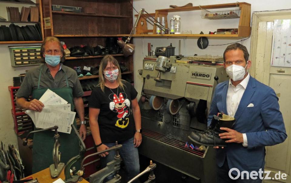 „Die Corona-Soforthilfe greift bei einem Einzelselbstständigen nicht“, erzählt er. Lediglich einen 52-seitigen Antrag für drei Monate Hartz IV bekam der Schuster vom Jobcenter auf Vermittlung der Corona-Soforthilfe erst auf zweites Nachhaken übersandt. „Binnen zehn Tagen sollte der Antrag aber dann beim Jobcenter zurück sein“, erläuterte Fuchs in seiner Werkstatt in der Johannisstraße dem Abgeordneten Albert Rupprecht, der ihn besuchte. „Aber mit einem Schreiben am 11. oder 12. Tag nach Antragserhalt war das Job-Center dann prompt mit dem Hinweis der Ablehnung, da die Pflicht der Mitwirkung nicht gegeben sei“, ärgerte sich Fuchs, da er wegen des Umfangs die Frist nicht einhalten konnte. Es wäre zum Ausfüllen ein Steuerberater und für das Schätzen seines Hauses als Wert ein Sachverständiger von Nöten gewesen.