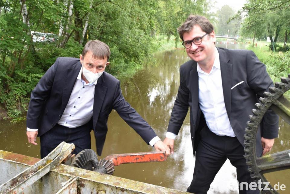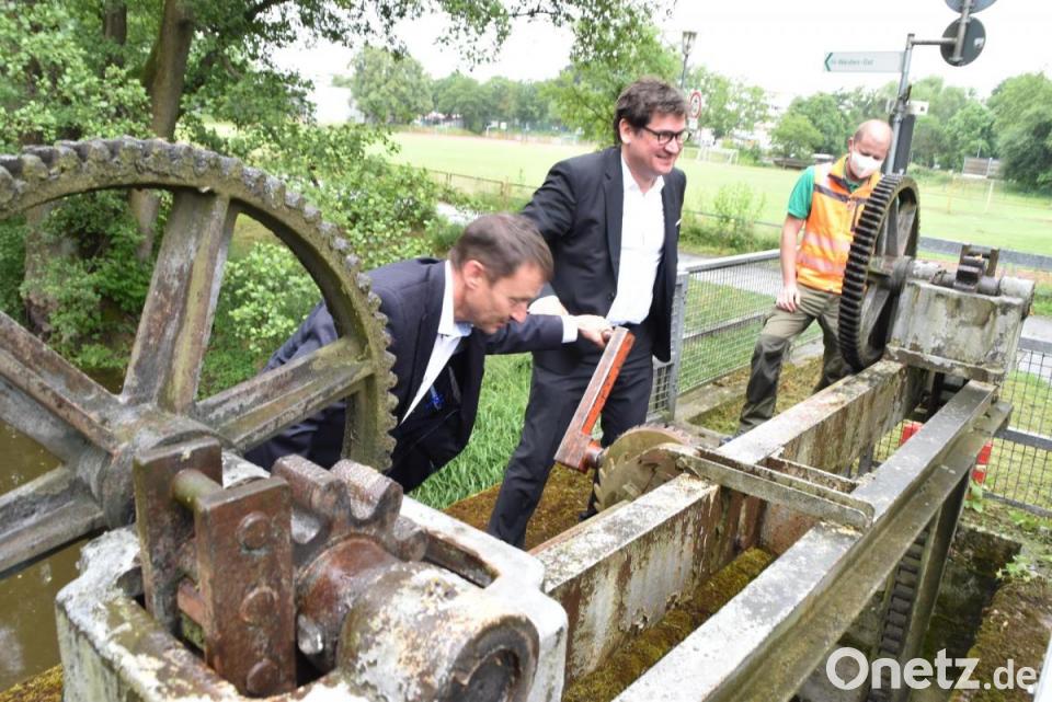 Mit einem Kraftakt eröffnete Oberbürgermeister Jens Meyer die Badesaison im Stadtbad. Zusammen mit Bau- und Planungsdezernent Oliver Seidel kurbelte er am Wehr die Sperrbretter nach unten, so dass das Wasser des Naab-Seitenarms angestaut wird.