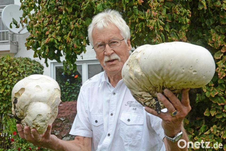 Selbst in Jahren, in denen Schwammerln zuhauf aus dem Untergrund schießen, gilt er als Rarität: Der Riesenbovist, so weiß Experte Hubert Seidl von der Stadt Weiden, "gedeiht nur auf gut gedüngten Gartenböden - wenn es warm ist, und wenn's regnet". Im Garten von Jörg-Christian Huck im Stadtteil Hammerweg ergänzen sich all diese Faktoren offenbar auf ganz wunderbare Weise. Im dritten Jahr in Folge erntet der Weidener nun Riesenboviste - heuer gleich vier an der Zahl. Der imposanteste ist fast so groß wie ein Medizinball und wiegt knapp zwei Kilo. Die anderen gleichen Fußbällen.