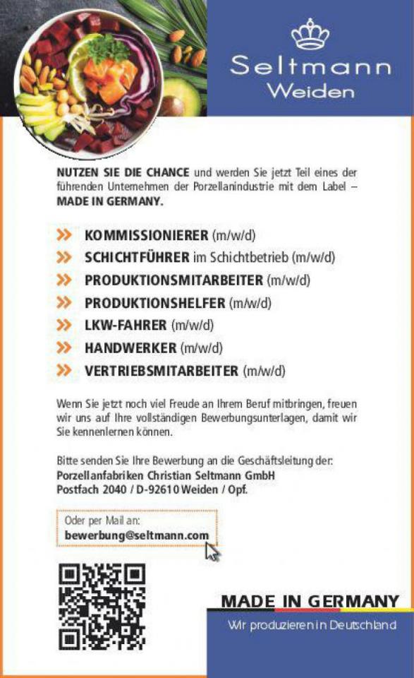 Die Unternehmensgruppe Seltmann besitzt als einer von wenigen weltweit operierenden Porzellanherstellern ein außergewöhnlich breites Produktions-Know How: Von der High-Tech-Fertigung (u.a. mit neuesten Industrierobotern) in einer der modernsten Porzellanfabriken Europas (Standort Erbendorf) bis zur reinen Handwerkskunst in den Manufakturen (Standort Rudolstadt / Thüringen).