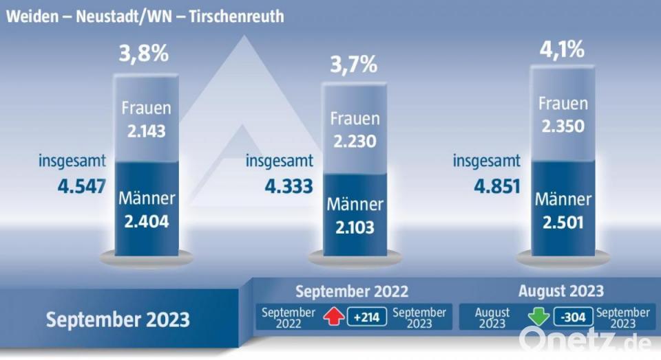 Gute Arbeitsmarktzahlen meldete die Agentur für Arbeit Weiden für den September. Die Zahl der Arbeitslosen sei um 304 Personen auf 4547 gesunken. Zugleich sei die Nachfrage nach Fachkräften ungebrochen hoch. 325 freie Stellen meldeten die Unternehmen im September. „Erfreulicherweise ist die Arbeitslosigkeit im September stabil geblieben und die Quote liegt bei 3,8 Prozent, also um 0,3 Prozentpunkte besser als im Vormonat August. 2404 Männer und 2143 Frauen sind im Agenturbezirk ohne Job. Jugendliche bis 25 Jahre nehmen ihre Chance wahr und starten in eine neue Beschäftigung oder beginnen eine Ausbildung oder ein Studium“, erläutert Thomas Würdinger, Vorsitzender der Geschäftsführung der Agentur für Arbeit Weiden. Binnen eines Monats sank deren Zahl um 16,4 Prozent auf 460 Arbeitslose.