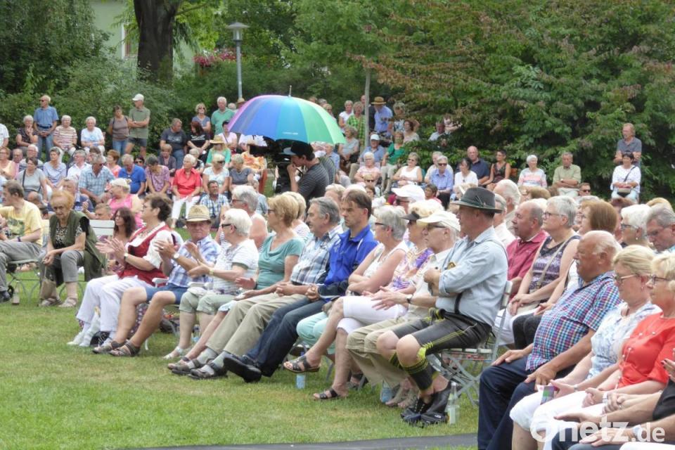 Die "Serenade der Volksmusik" hat eine treue Fan-Gemeinschaft. Für den Musikproduzenten Thomas Stein ist "Volksmusik die Parkbank für die menschliche Seele". Wenn dann noch das angekündigte Gewittertief ausbleibt, steht einem unterhaltsamen Sonntagnachmittag im Grünen nichts im Wege. Angeführt von Organisatorin Gertrud Wittmann und Moderator Lothar Höher zogen die vier Musikgruppen gemeinsam auf die Bühne.
