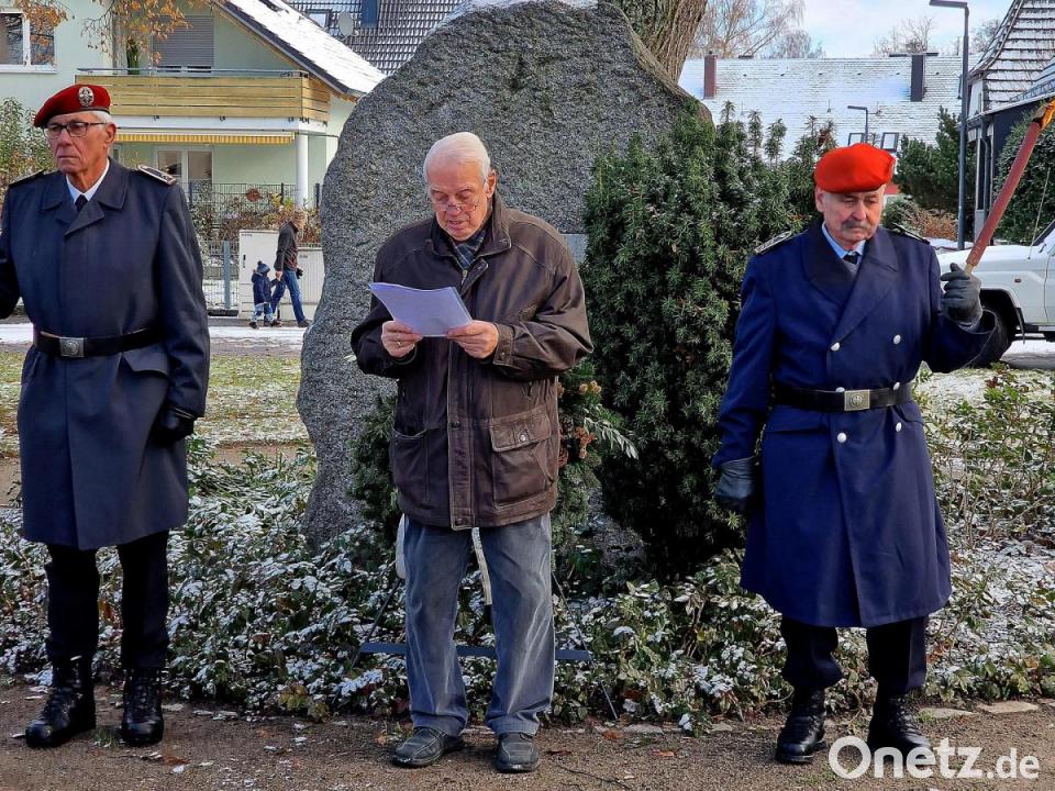 Im Gedenken am Mahnmal in der Moosfurtsiedlung erinnerten die Teilnehmer nicht nur an die Opfer der beiden Weltkriege, sondern auch an die Kämpfe in der Ukraine, Syrien und Konflikte im Nahen Osten. Stadtrat a. D. Helmut Ruhland sagte, wie weit wir global von Frieden und Verständigung entfernt sind. Friede sollte aber in der eigenen Familie sowie in der Gemeinschaft beginnen und von dort hinausgetragen werden in das Land und in die Völker. Denn auch in unserer unmittelbaren Umgebung entstünden Neid, Hass, Ungerechtigkeit und Hetze. „Die Toten verpflichten die Lebenden“, diese Mahnung müsse die Menschen durch so eine Gedenkfeier erreichen. Solche Gedenktage und ein Innehalten zeigen uns auf, welche aktuelle Bedeutung für uns und auch für alle kommenden Generationen so ein Tag hat. Ruhland sprach abschließend ein Gebet und legte als äußeres Zeichen des Dankes mit der Vorsitzenden der Siedlergemeinschaft, Edith Schimandl, einen Kranz am Gedenkstein nieder. Die beiden Reservisten- und Marinekameraden übernahmen mit Fackeln die Ehrenwache.