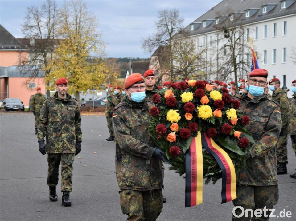 In Gedenken an die gefallenen Soldaten legten Podzus und der Bataillonskommandeur des Artilleriebataillon 131, Oberstleutnant Thorsten Wallschus, am Gedenkstein in der Ostmark-Kaserne einen Kranz nieder. Zu den Trompetenklängen des “Liedes vom guten Kameraden“ wurden die Namen aller 59 in diesem Einsatz gefallenen Soldaten verlesen. Ein bewegender Moment für viele Angehörige des Verbandes.