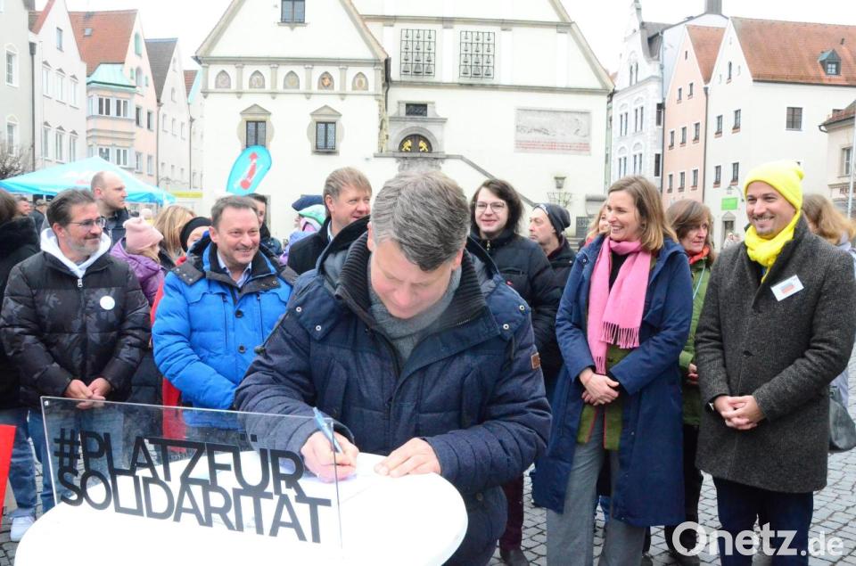 Mit ihrer Unterschrift setzten auch Oberbürgermeister Jens Meyer (SPD), Benjamin Zeitler (CSU), Jürgen Meyer (Bürgerliste), Florian Vogel (FDP), Robyn Arnold (Die Linke), Saskia Kosmus (Junge Union) und Markus Emmerich (Freie Wähler) vor der Kulisse des Alten Rathauses ein gemeinsames Zeichen. In bewegten Zeiten gehe es darum, Haltung zu zeigen, betonten sie. Solidarität, Respekt und die Achtung der Menschenrechte seien keine Schlagworte, sondern Grundlage kommunalpolitischer Verantwortung.