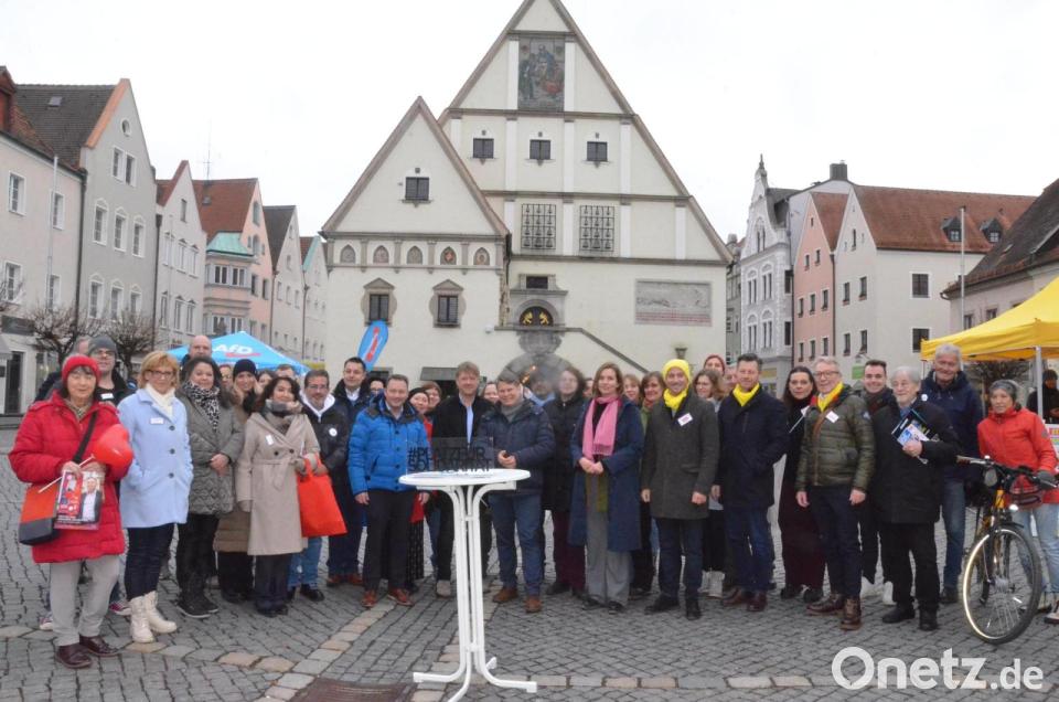 Auf dem Oberen Markt in Weiden gab es am Samstagvormittag einen Schulterschluss über die Parteigrenzen hinweg. Zwischen Infoständen, Valentinsblumen, Luftballons und Wahlplakaten unterzeichneten führende Vertreter demokratischer Parteien, die sich um ein Mandat im künftigen Stadtrat bewerben, die „Weidener Demokratie-Erklärung“. Initiiert hatte die Aktion die Grünen-Kandidatin Laura Weber.