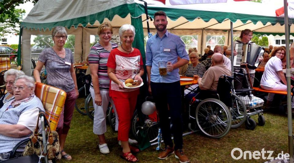 Die hauswirtschaftliche Leitung Monika Hammer, hat alles bestens geplant und organisiert und sorgt am Tag selbst, zusammen mit unzähligen Helfern aus allen Bereichen, für einen reibungslosen Ablauf. Schon am Vortag wird im Garten das Zelt aufgebaut und mit Tischen und Bänken bestückt. Dann ist alles bereit für das große Sommerfest. Das Mittagessen und der Nachmittagskaffee für die Senioren und Seniorinnen finden einmal nicht im Speisesaal, sondern im Grünen, unter schattigen Eichenbäumen statt. Das Wetter sommerlich, die Tische fröhlich bunt gestaltet. Die Küche hat Salate für alle vorbereitet, der Koch grillte Steaks und Bratwürste und es gibt erfrischende Getränke. Das Personal aus der Pflege und der Betreuung übernimmt den Service und umsorgt alle Bewohner, so dass es an nichts fehlt.